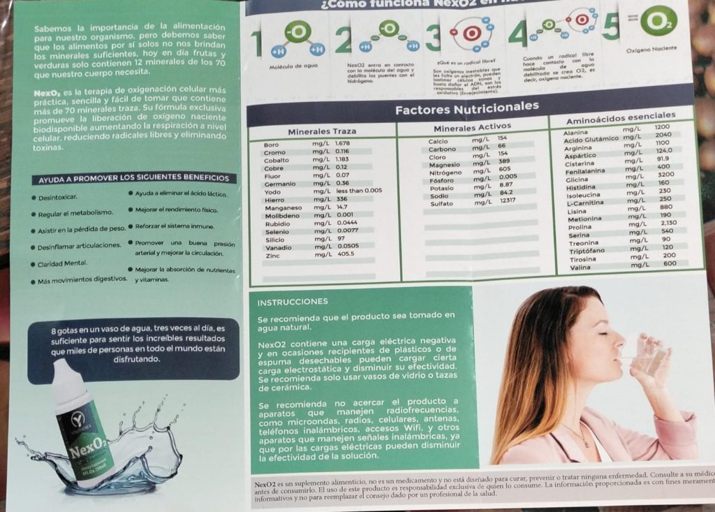 NexO2 es un líquido coloidal altamente concentrado que está registrado como una fórmula exclusiva, que contiene 70 elementos traza y minerales (obtenidos de plantas fosilizadas en tierras vírgenes y delos limpios mares del sur en torno a NuevaZelanda, sin refinar y que aún contiene elementos trazas naturales), combinado